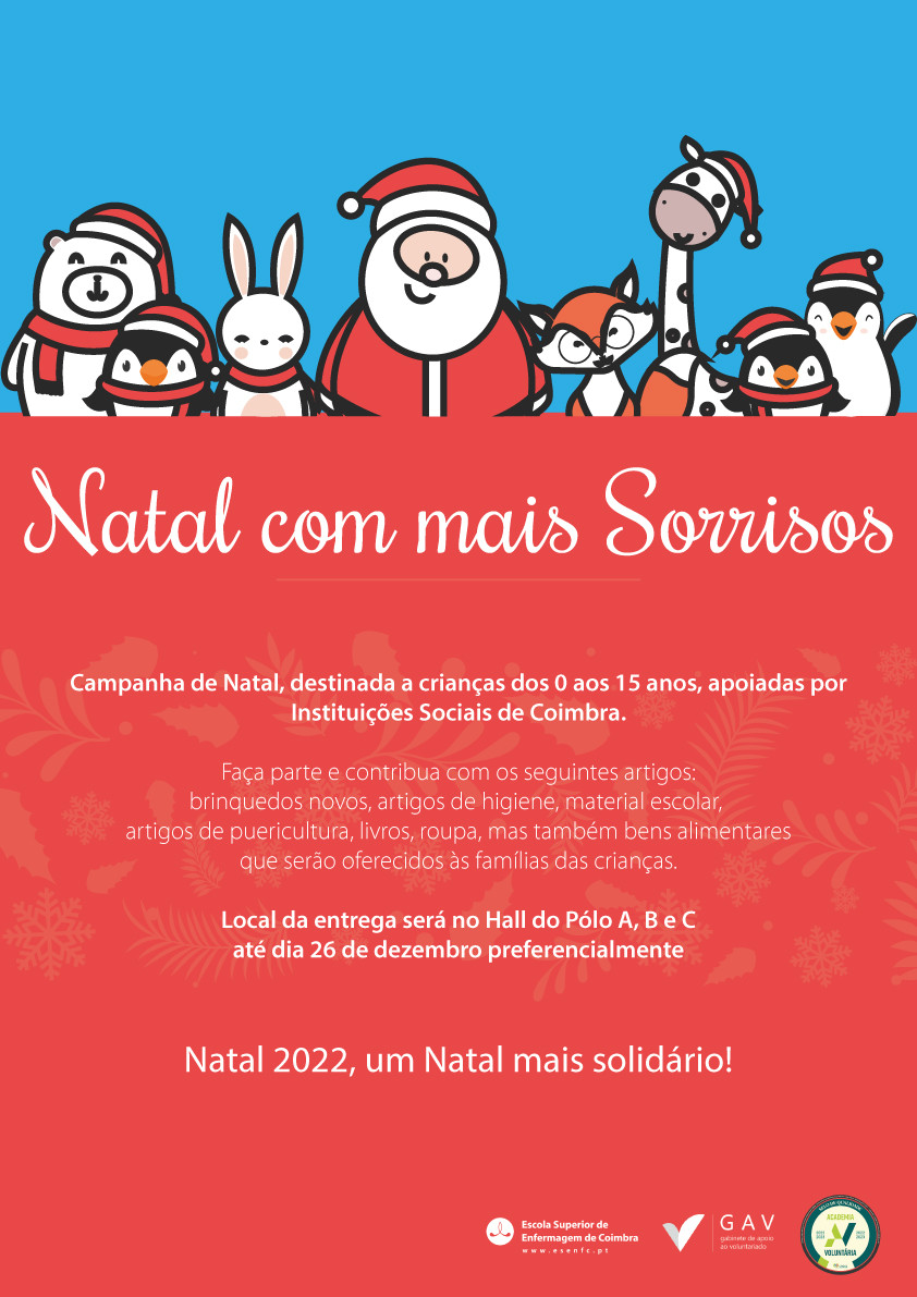 “O Gabinete de Apoio ao Voluntariado (GAV) da Escola Superior de Enfermagem de Coimbra vai promover a campanha “Natal com mais Sorrisos”, destinada a crianças dos zero aos quinze (0-15) anos, apoiadas por instituições sociais de Coimbra.