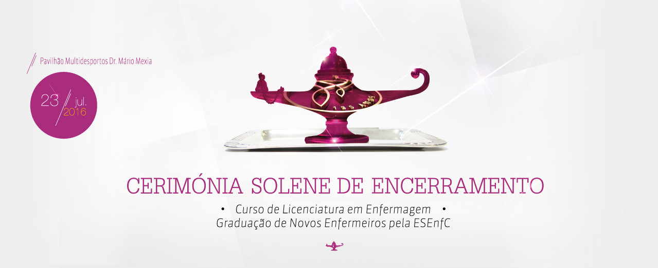 A Presidente da Escola Superior de Enfermagem de Coimbra, Maria da Conceição Saraiva da Silva Costa Bento, tem a honra de convidar V. Exª para as Cerimónias de Encerramento do Curso de Licenciatura em Enfermagem no dia 23 de Julho de 2016.