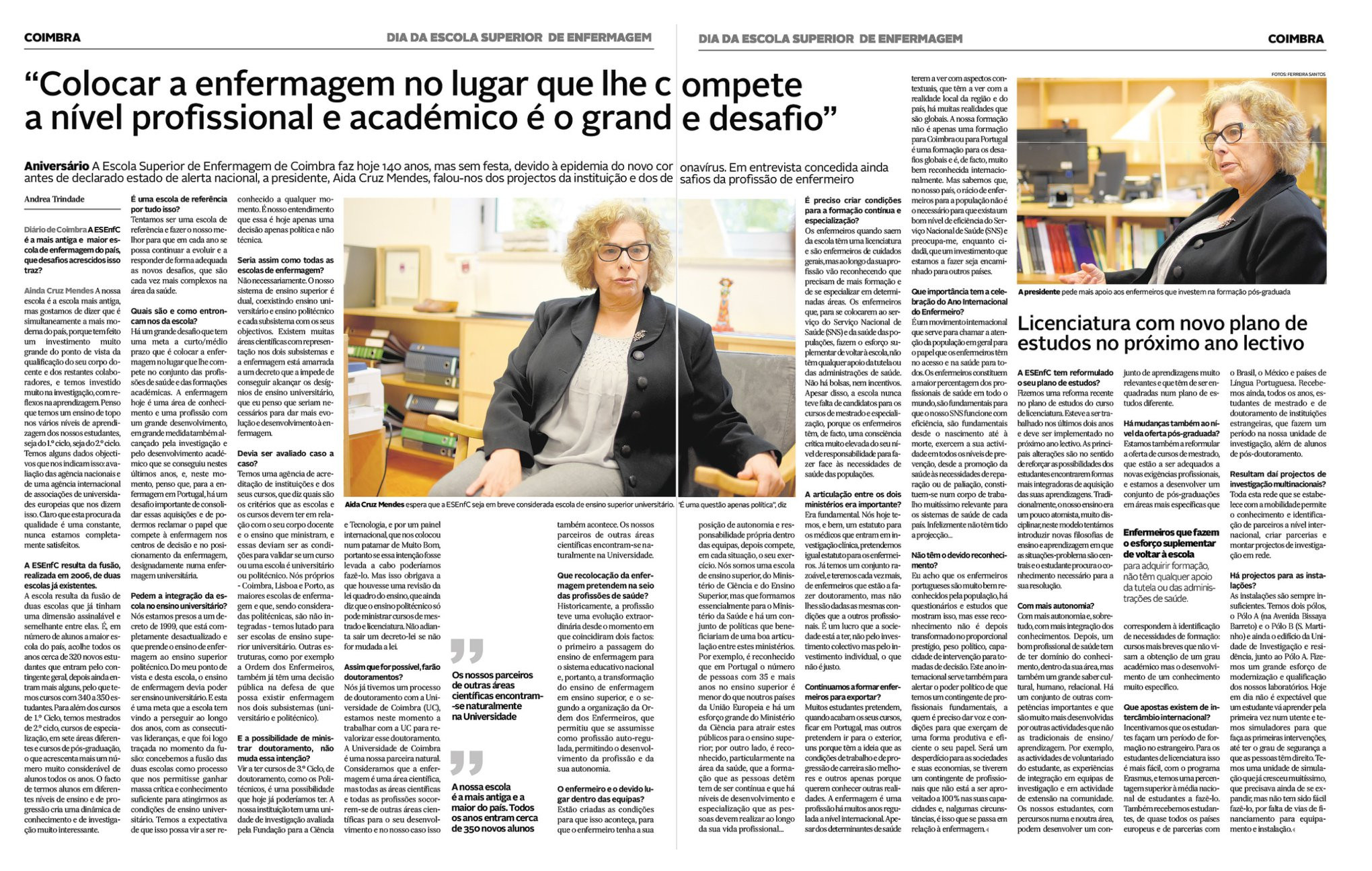 17 de março é o Dia da Escola Superior de Enfermagem de Coimbra. Em entrevista ao Diário de Coimbra, a Presidente da ESEnfC, Aida Cruz Mendes, refere que um dos grandes desafios passa por «colocar a enfermagem no lugar que lhe compete no conjunto das profissões de saúde e das formações académicas». Fala de alguns projetos da instituição, da recorrente e adiada questão da integração da enfermagem no ensino universitário e da oferta do 3º ciclo de estudos (também bloqueada por uma revisão legislativa que tarda). A dirigente revela, ainda, um novo plano de estudos no curso de licenciatura e anuncia mudanças na formação pós-graduada. Leia tudo na entrevista concedida à jornalista Andrea Trindade.
