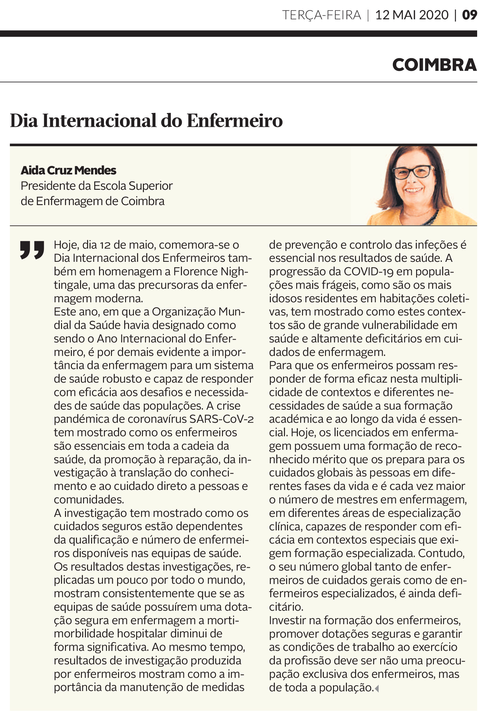> Presidente da Escola Superior de Enfermagem de Coimbra, Professora Aida Cruz Mendes, escreve, no Diário de Coimbra, sobre o Dia Internacional do Enfermeiro (artigo de opinião).