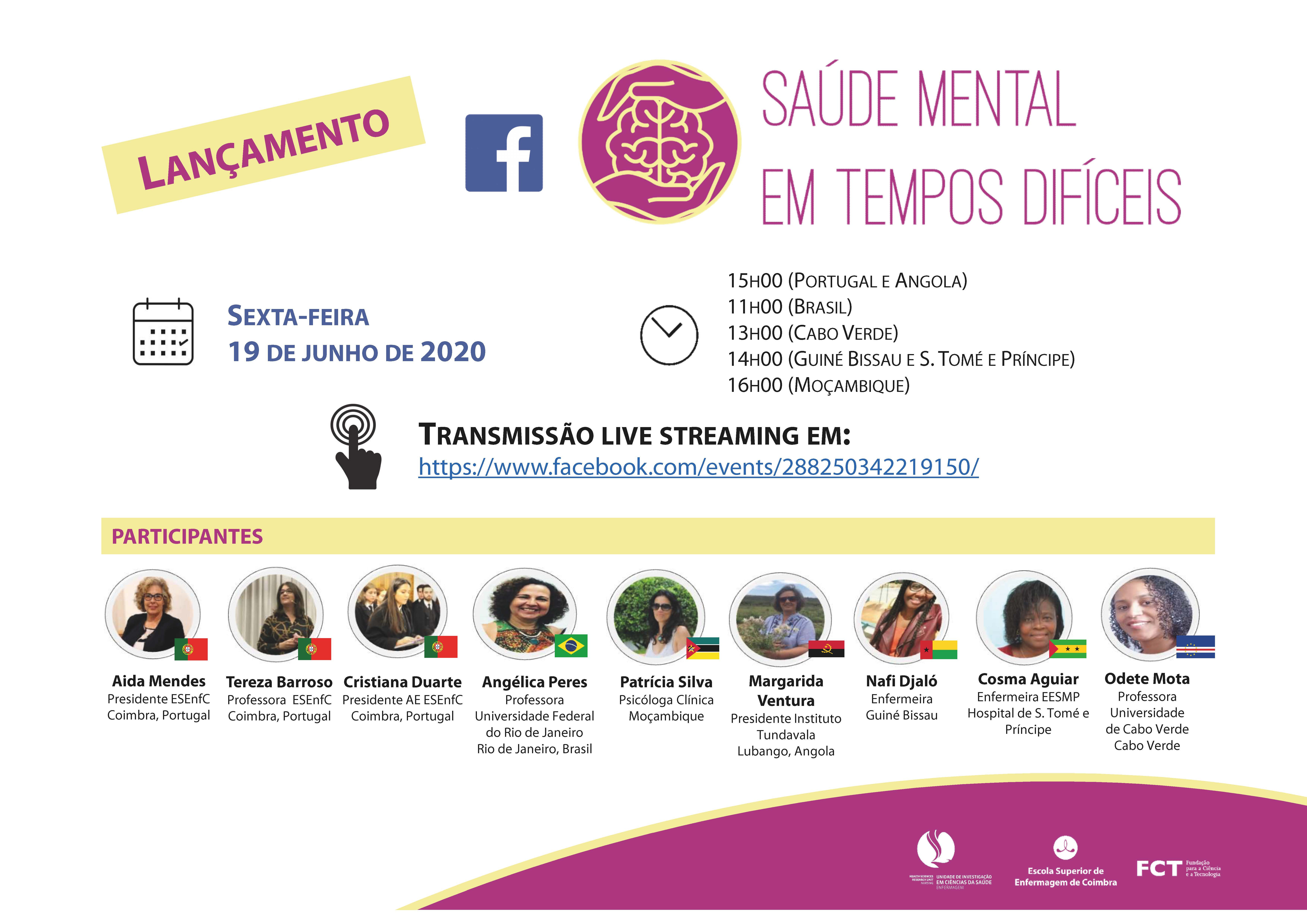 Lançamento da rede social facebook Promoção da Saúde Mental em Tempos Difíceis. A página, criada por um grupo de estudantes finalistas de enfermagem, em conjunto com professores da ESEnfC, será lançada amanhã dia 19 de junho, entre as 15h00 e as 16h00 através de livestreaming em https://www.facebook.com/events/288250342219150/
