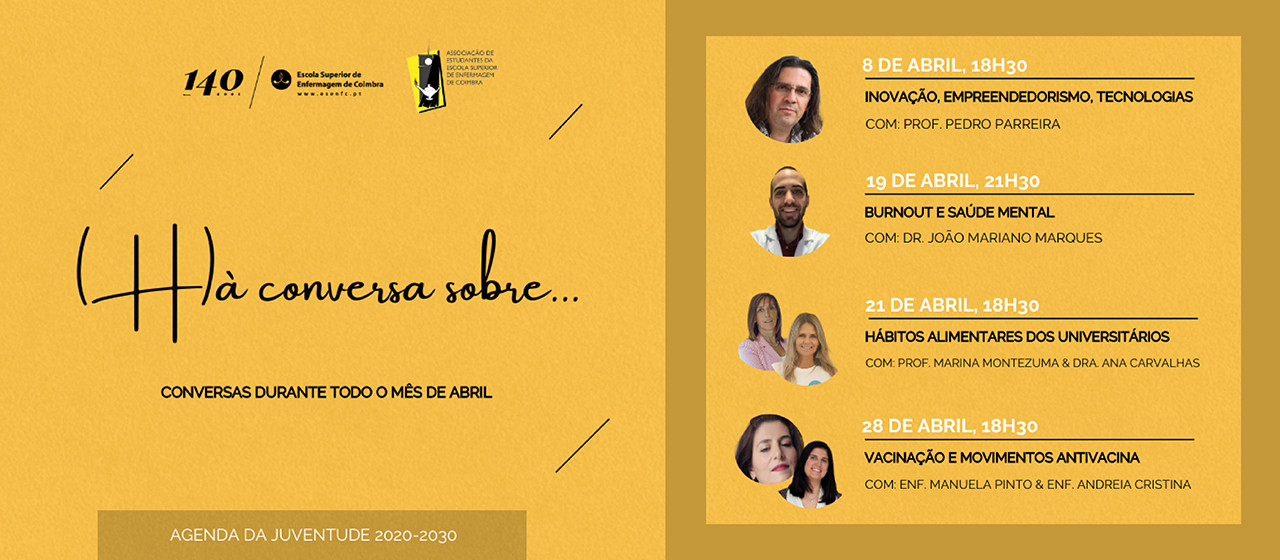 No âmbito das comemorações, pela ESEnfC, dos 140 anos de ensino de Enfermagem, a Associação de Estudantes da instituição organiza, em abril, a ação “(H)à conversa sobre...”, que pretende ser, igualmente, um contributo para iniciativa Agenda da Juventude para a Saúde na Próxima Década 2020-2030.
