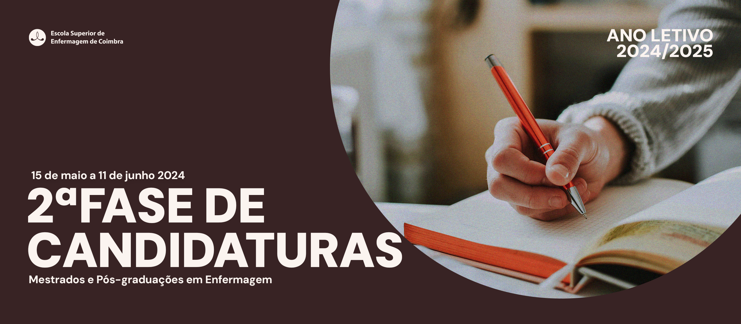 A 2ª fase de candidaturas (online) aos cursos de mestrado e de pós-graduação em funcionamento, no ano letivo de 2024-2025, na Escola Superior de Enfermagem de Coimbra decorre entre os dias 15 de maio e 11 de junho.