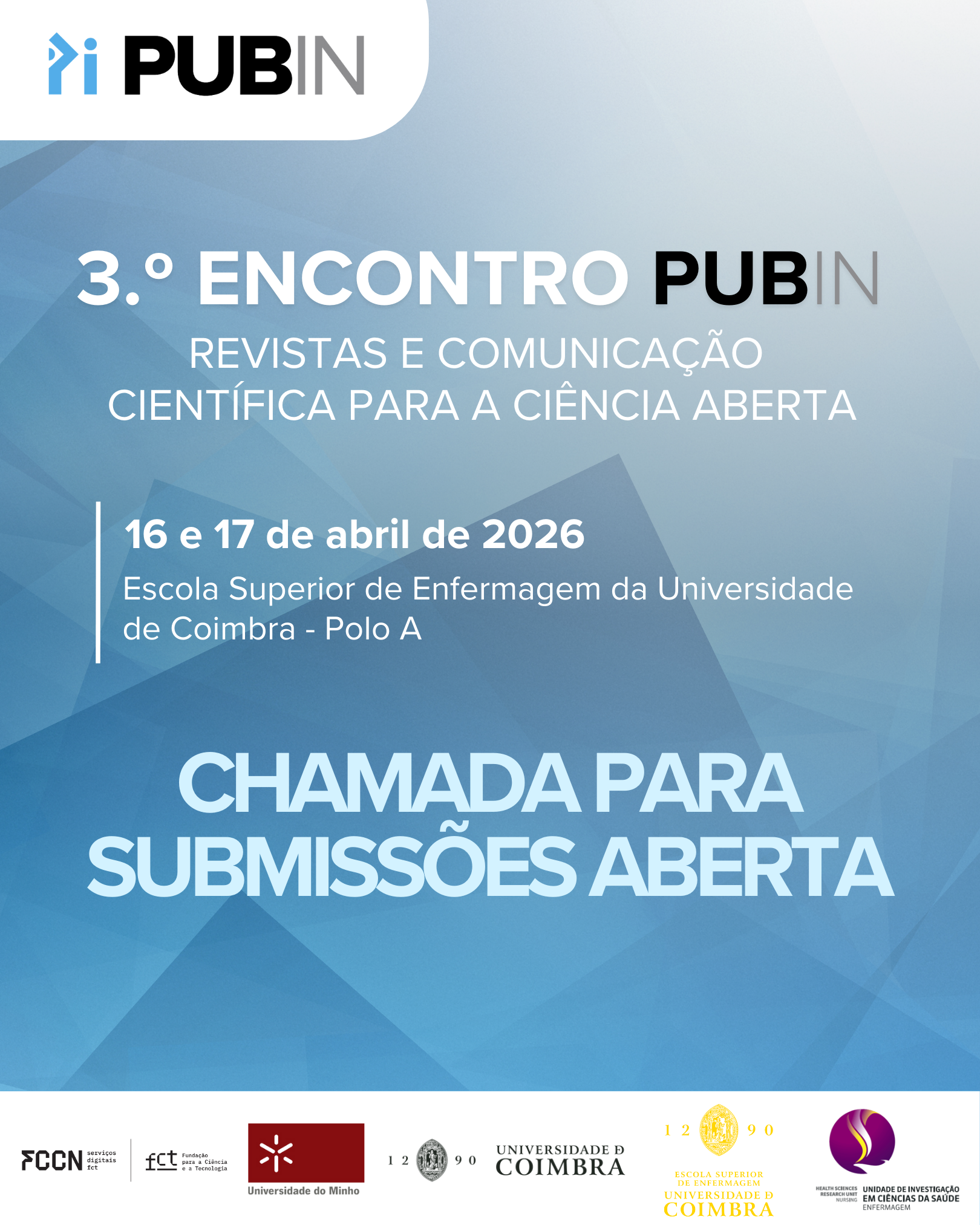 O 3.º Encontro PUBin realiza-se nos dias 16 e 17 de abril de 2026, na Escola Superior de Enfermagem da Universidade de Coimbra.
