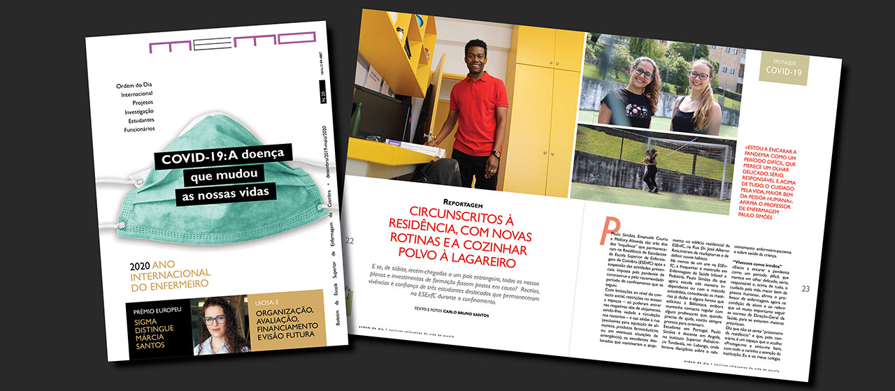Está disponível, desde o início de agosto na versão impressa (apenas 500 exemplares), mas também online (https://issuu.com/esenfc/docs/m20___e), a edição nº 20 do MEMO, boletim semestral da Escola Superior de Enfermagem de Coimbra (ESEnfC), que traz como tema principal para capa o modo como a pandemia do novo coronavírus afetou a vida na instituição, a começar pela suspensão dos ensinos clínicos e todas as atividades letivas presenciais, passando pelo reforço da formação em novas tecnologias para o corpo docente assegurar o ensino à distância, pelo teletrabalho e por algumas atividades de solidariedade e entreajuda.