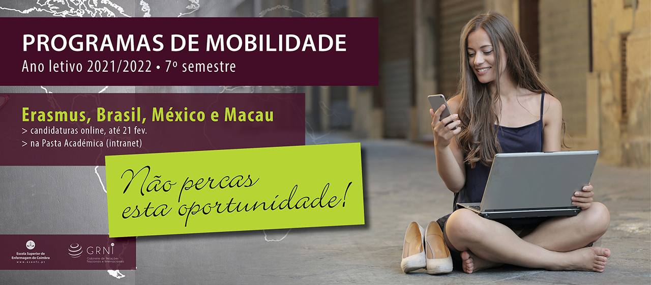 O Gabinete de Relações Nacionais e Internacionais da ESEnfC informa que estão abertas candidaturas para a realização de períodos de mobilidade académica (através do Programa Erasmus +, ou acordos de cooperação com o Brasil, o México e Macau), durante o 7º semestre do ano letivo de 2021-2022.